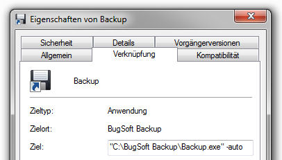 Es ist möglich BugSoft-Backup über Verknüpfungen oder Taskplaner zu starten und den Backupvorgang nach dem Programmstart automatisch in Gang zu setzen. Dazu muss bei einem Programmstart der Datei "Backup.exe" nur der Parameter "-auto" übergeben werden.