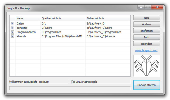 Neue Backup-Aufgaben sind erst einmal nicht angehakt. Nachdem BugSoft-Backup gestartet wurde, sind immer automatisch alle Aufgaben angehakt.