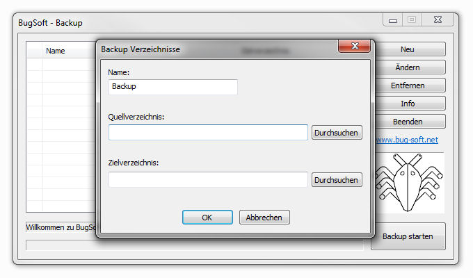 Anschließend öffnet sich das oben zu sehende Dialogfenster, in dem man einen Namen, das Quellverzeichnis und das Zielverzeichnis angeben muss. Der Name kann beliebig vergeben werden und dient lediglich zur besseren Orientierung, wenn es viele Backup-Aufgaben in der Liste gibt. Das Quellverzeichnis ist das Verzeichnis, von dem ein Backup erstellt werden soll. In das Zielverzeichnis werden beim Backup alle Dateien aus dem Quellverzeichnis kopiert. Das ist also der Ort, wo das Backup abgelegt wird.